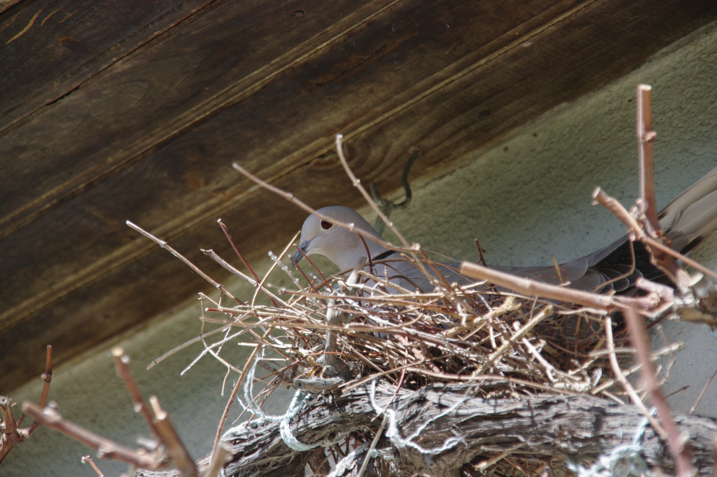 Les observe de loin une autre pensionnaire, en l’occurrence une tourterelle qui a choisi de couver au dessus de la porte du séjour, bien à l’abri de la pluie.